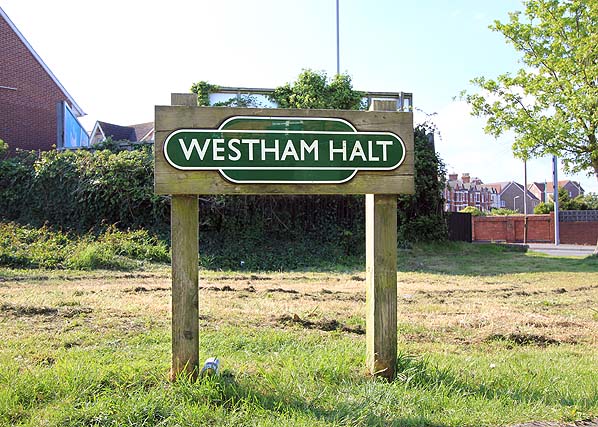 ![]() Reproduction totem sign at the north end of Westham Halt platform. The halt did not have totem signs when it was open.