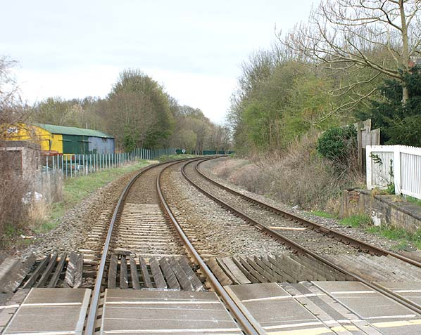 The site of Weston Rhyn station looking south on 6 April 2012. To the left of the line can be seen the former station goods shed.