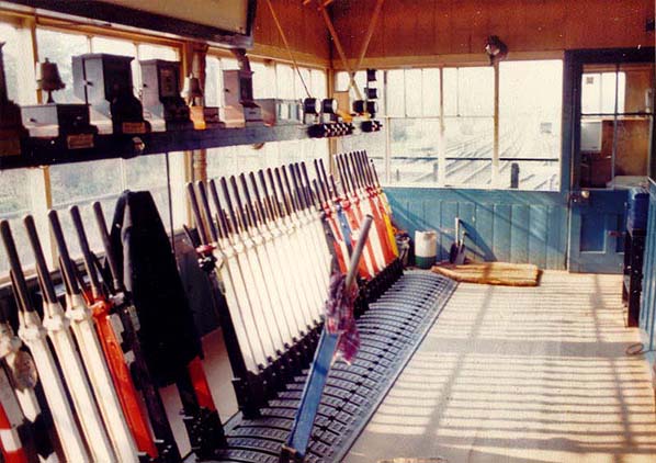In 1924 the signal box was rebuilt. Its brick base was extended and fitted with a new GWR type 28b timber top. It was equipped with a 47-lever Great Western Railway Vertical Tappet 3-bar frame.