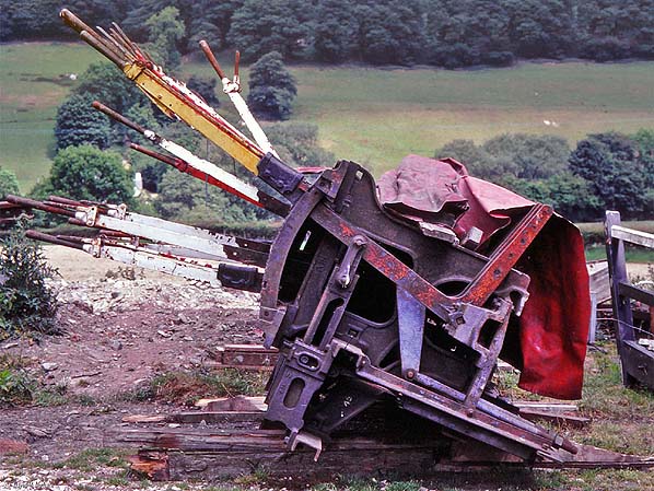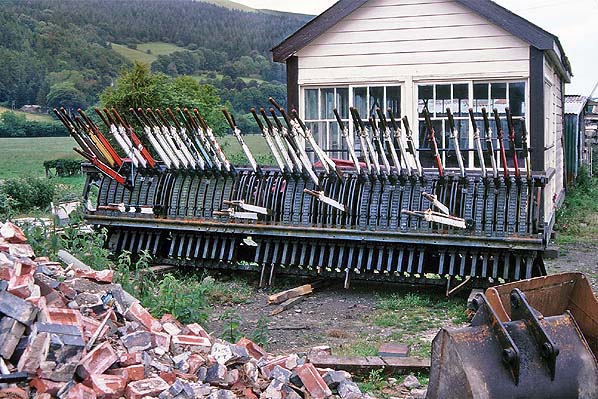Photo by David Ingham ![]() Weston Rhyn signal box in store at Carrog station on 24 June 1995. Photo by David Ingham ![]() The 47 lever GWR Vertical Tappet 3-Bar frame from Weston Rhyn signal box with the upper cabin seen in store at the Llangollen Railway Carrog station goods yard on Saturday 24 June 1995. Photo by David Ingham ![]() The 47 lever GWR Vertical Tappet 3-Bar frame from Weston Rhyn signal box at Carrog on 24 June 1995. Photo by David Ingham