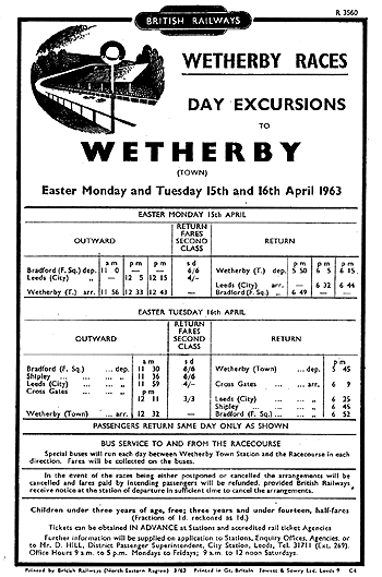Wetherby racecourse opened in 1891, and an untimetabed station was opened c1924 to serve it. This was last used on 18 May 1959, but racecourse specials continued to run to Wetherby station from Bradford Exchange on race days until 1963. A new station called Penda's Way, between Scholes and Cross Gates, was opened on 5 June 1939 to serve the growing residential development in that area.