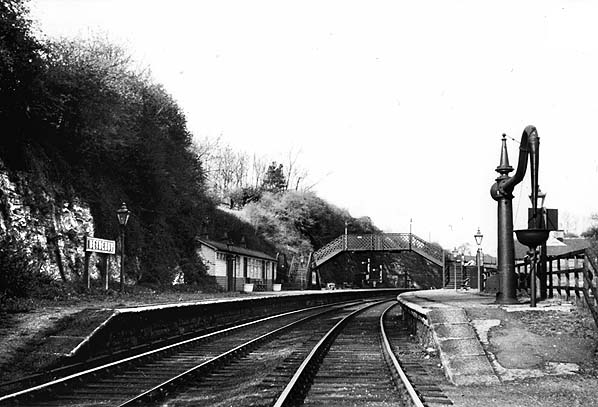 Wetherby station looking north-east in April 1954. Water columns were sited at the south end of the up platform and at the north end of the down platform.