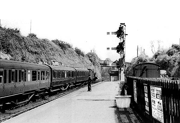 A northbound passenger train waits at the down platform at Wetherby station in spring 1959. Devils Toenail Junction is seen under the bridge with the Harrogate line to the left