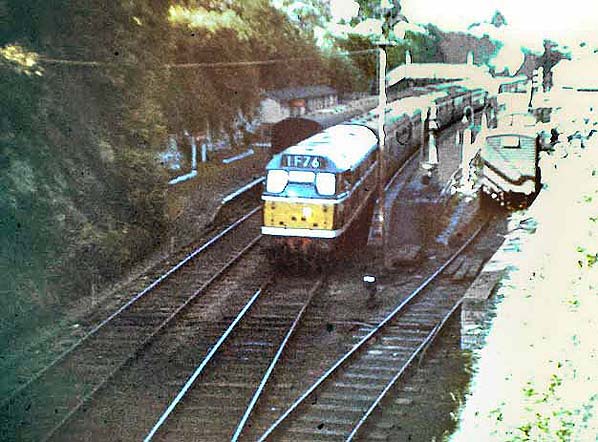 Wetherby station looking north-east from Linton Road bridge in 1960. The Wetherby lines were dieselised in 1959. A Leeds train waits in the up platform while a steam-hauled northbound train prepares to depart from the down.