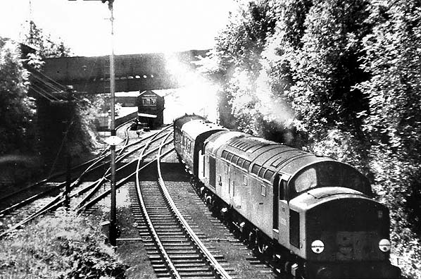 Having just passed through Wetherby station a Deltic-hauled Liverpool to Newcastle express takes the Harrogate curve at Devils Toenail Junction in 1963