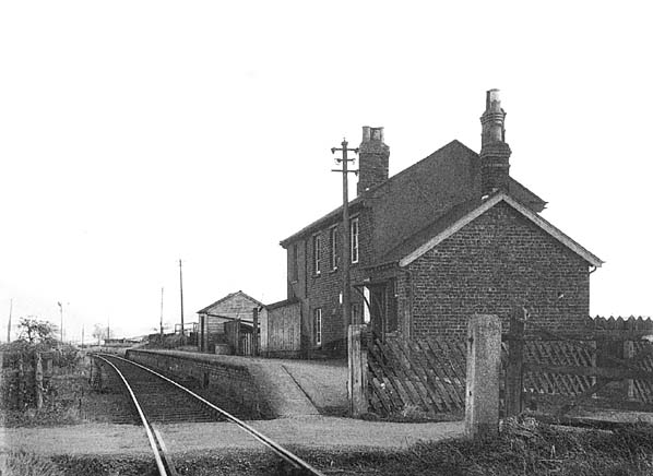 Wetwang Station looking east in 1958. The lower part of the station building is the booking office. The wooden building in the middle of the platform is the lockup parcels warehouse.