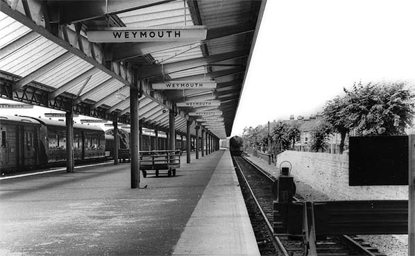 Weymouth station looking north along platform 6 in the 1960s. Whilst the earlier platforms continued to be gas-lit until the mid 1970s this platform, constructed in 1957, was electric-lit in a style not commonly seen on the Southern Region.