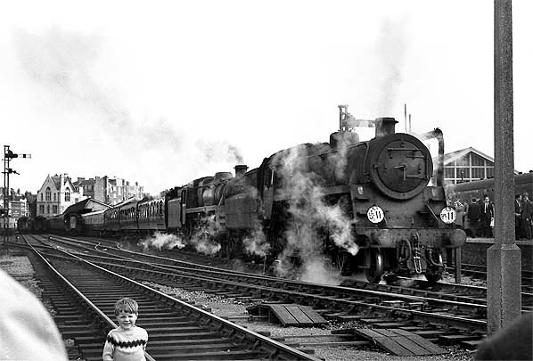 L.C.G.B. The Dorset Coast Express railtour at Weymouth station on 7 May 1967. The tour was double-headed between Weymouth and Bournemouth Central by 73029 (inside) and 76026.