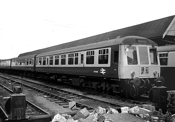 A DMU in one of the stabling roads at Weymouth c1971.