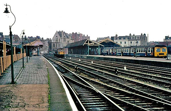 station looking south along platform 4 towards the buffers in April 1975. Note the distinctive gas lamp standards of a GWR / early BR Western Region style
