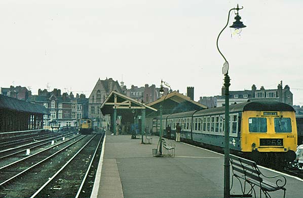 Weymouth station looking south along platform 3 in April 1975. A Swindon class 120 DMU is waiting