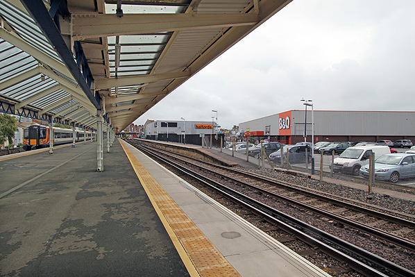 Weymouth station looking south from platform 3 in July 2013. The B & Q store is on the site of the goods shed.