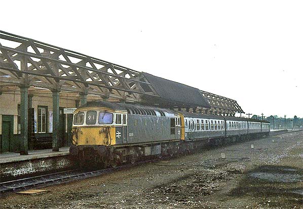 A Class 33/1 has arrived at Weymouth station platform 3 in 1984