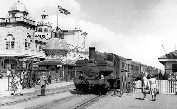 ![]() One of the tramway tank engines is waiting to take a boat train back to Weymouth Junction in July 1950. This is a 1366 Class Pannier tank, designed by Collett and built by the GWR in February 1934. Only 6 of these locos were built with a low axle loading and short wheelbase, which was suitable for dockyards and also the Wenford Bridge china clay branch, where they displaced the popular but ageing Beattie Well Tanks.