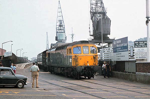 Having run round its coaches a Class 33 is backing on to its coaches ready for the return journey from Weymouth Quay to Weymouth Junction in August 1977