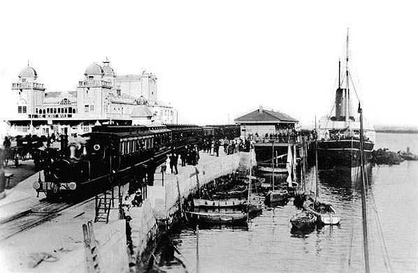 ![]() Weymouth Quay c1908. Many of the trains were too long for the platform as can be seen here. When this happened a set if steps was leant against the running board to allow passengers to disembark.