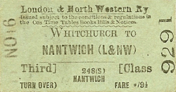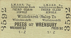 Today the station has only two platform faces with one of the island platform faces now being out of use. A footbridge still connects the two platforms. The station buildings were demolished many years ago. The train service is provided by Arriva Trains Wales and the station is now unstaffed. A single road engine shed was provided alongside the station on 1st October 1872. This was replaced by a new four road brick shed in 1883. This remained in use until September 1957 when the Waverton - Whitchurch line was closed. It was later used as a wagon shop but has subsequently been demolished. Further reading: Down the Line by RM Bevan - A nostalgic journey along the old branch railway from Waverton (Chester) to Whitchurch, CC Publishing. Tickets from Michael Stewart To see stations on the Waverton - Whitchurch line click on the station name: Grindley Brook Halt, Malpas, Broxton, Tattenhall & Waverton To see stations on the Oswestry - Whitchurch line click on the station name: Fenn's Bank, Bettisfield, Welshampton, Ellesmere, Frankton, Whittington High Level, Tinkers Green Halt & Oswestry |