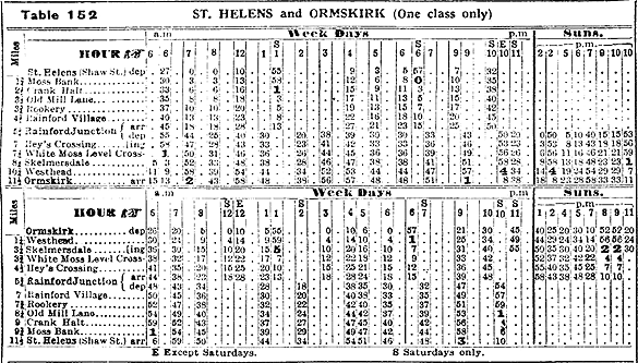In January 1922 the LYR merged with the LNWR and the July 1922 timetable showed 17 up and 16 down services Monday-to-Friday. There was an extra down service on Saturdays and there were 10 trains in each direction on Sundays. On Sundays there were only 3 trains in each direction on the St Helens line but they did connect with the Ormskirk service.