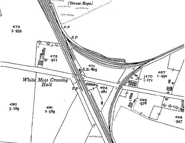 Notes: White Moss Level Crossing Halt was situated on the Lancashire & Yorkshire Railway (LYR) Rainford Junction and Ormskirk line which had opened as a through route on 1 March 1858. When the line opened to passengers there was only one intermediate station and that was at Skelmersdale (originally called Blaguegate). The line made an end on connection with the St Helens and Rainford Junction railway at Rainford which allowed for through running. The St Helens line had been opened by the St Helens Canal & Railway Company but passed to the London & North Western Railway (LNWR) in 1864. Passenger services however ran into Rainford Junction station which was located on the Liverpool and Wigan line. At Rainford Junction there were timetabled connections to and from St Helens as well as the travel opportunities offered by the main line.