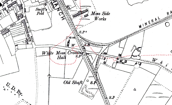Sometime before 1865 a branch was opened from White Moss Lane to White Moss Colliery. The branch ran east from White Moss Lane and had connections to the main line running north and south which formed a triangle. White Moss Lane had two level crossing one of which carried the main line over the road and the other slightly to the east which carried the south to east spur of the colliery line.