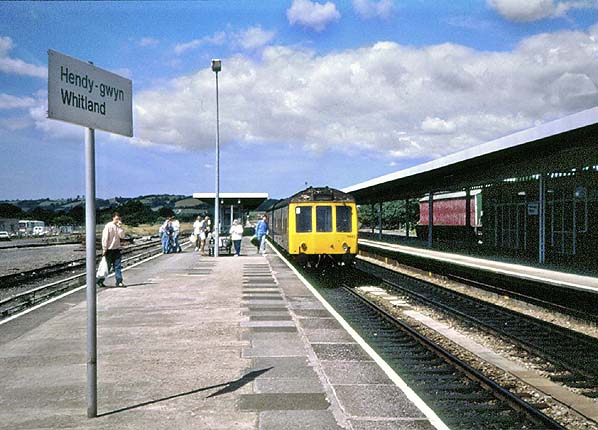 Whitland station looking west in July 1989. A DMU stands in the down main line platform.
