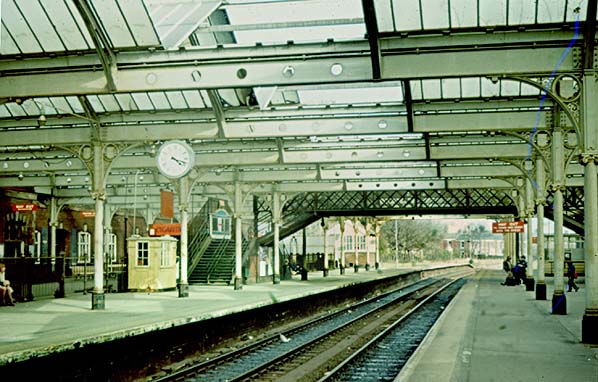![]() Looking east from the south platform of Whitley Bay station in April 1973. The interior of the station has changed little since it was built in 1910, although the glazing has been removed from the section of the roof above the tracks. Photo by Alan Young