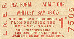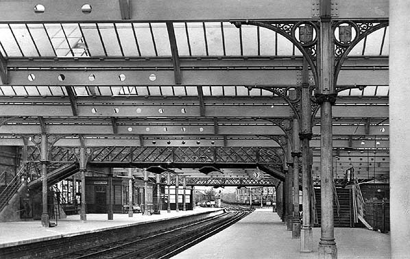 ![]() A strangely deserted Whitley Bay station in 1912, looking west from the north platform. The ridge-and-furrow construction of the roofing can be appreciated, and at this time it covered the tracks as well as the platforms. The shields set into the brackets on the columns will be noted. Copyright photo from John Alsop collection