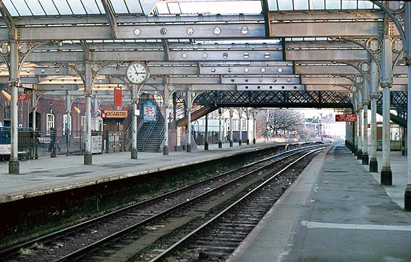 ![]() Looking east from the south platform of Whitley Bay station in January 1978. The interior of the station is little changed since it was built in 1910, although the glazing has been removed from the section of the roof above the tracks. Photo by Alan Young