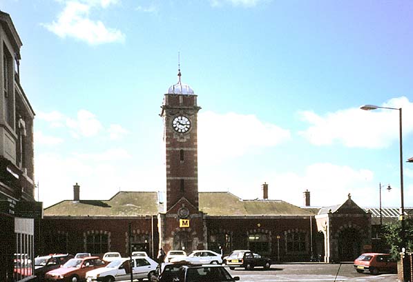 ![]() The exterior of Whitley Bay station, looking south in August 1998. Since this picture was taken glazed verandahs have been installed between the flanking gabled porches and the clock tower to restore the frontage to how it looked until the mid 1970s. Photo by Alan Young