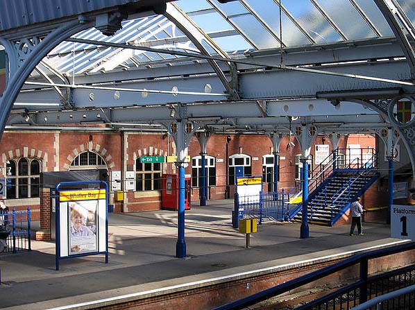 View of the wide north platform (platform 2) and concourse from the west footbridge in October 2011.