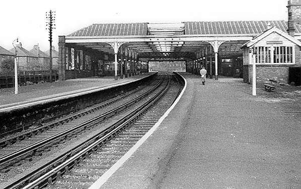 A general view of Whitley Bay station in 1959, looking west from the north platform.