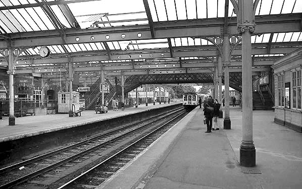 Looking east along the south platform of Whitley Bay station in 1972. A class 104 DMU is entering the station en route to Newcastle via Benton.
