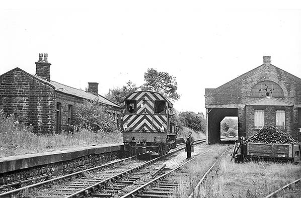 Photo by Ian G Holt ![]() From 1963 Whitworth was the northern terminus of the former Rochdale-Bacup line, and only freight traffic was handled after passenger services were withdrawn in 1947.On Saturday 19 August 1967 D3845 is seen at Whitworth station in this southward view. This was the day when the final freight train ran, and wagons remaining on the branch were removed. The platform has a profusion of weeds and the building is derelict. The loop line still passes through the goods warehouse, and a further siding can be seen in the foreground. On 21 August the railway was officially closed and the rails were removed by the end of 1967. After closure Whitworth goods yard remained in commercial use as a coal yard, but since 1988 the site has been occupied by sheltered housing