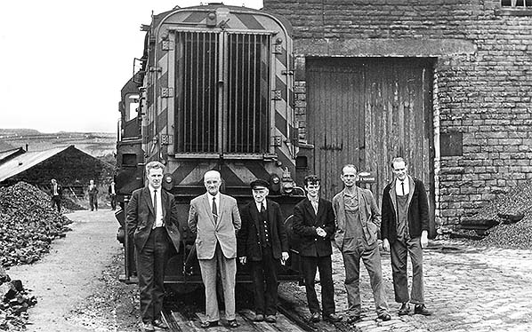 Photo by Ian G Holt ![]() A group photo to commemorate the departure of the last train from Whitworth on 19 August 1967. D3845 is standing on the siding west of the goods warehouse. The gentleman in the suit, second from the left, is Joe Taylor the Whitworth coal merchant, whose coal traffic kept the Shawclough (for Turners Asbestos) - Whitworth section open when all other rail traffic had disappeared from the Whitworth Valley. The Area Manager, whose name is not known, is standing far left. To the right on Mr Taylor are driver Clifford Stansfield, fireman Bill Tonge, Guard Terry Hernon. The shunter's name is possibly Charlie Kidger.