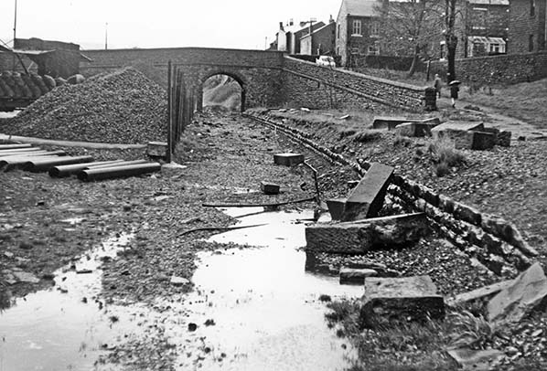Photo by Ian G Holt ![]() Whitworth station looking north in 1971. Until 1967 the rails were in place and in use, and the station building was standing, though derelict. In this view the building, formerly on the platform to the extreme right, has gone, the tracks have been lifted and the platform’s edge stones have been removed: some of them lie on the trackbed in the foreground. Pedestrians are using the sloping track by which the station was reached from Hall Street, which crosses the railway by the bridge. The former goods yard (left) is used by Joe Taylor, the coal merchant. Today the view ahead from this point is a manicured lawn with a vegetated bank up to the bridge parapet; to the right, the sloping track is now a road called Massey Croft; and the site of the coal yard to the left is now occupied by Riddiough Court (sheltered housing).