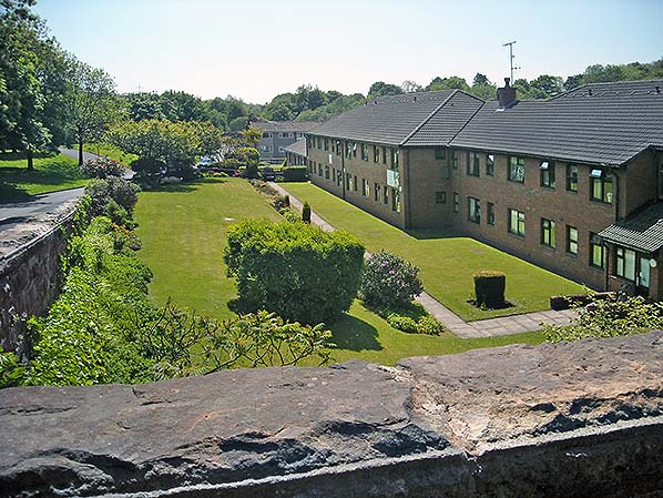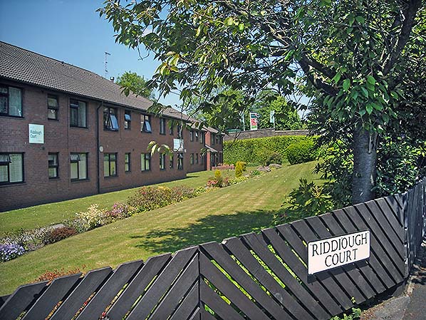 Photo by John Mann ![]() The site of Whitworth station is now occupied by Riddiough Court, a sheltered housing development. In this northward-facing view of June 2015 the modern buildings are on the former goods yard whilst the running line, platform and station building were in the sloping grassed area beyond the fence. Hall Street, in the background, is elevated and the former parapet of its bridge over the railway is visible.