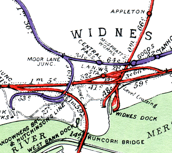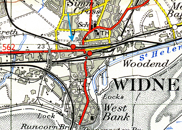 East of the station the line passed over Victoria Road which, at that time, was the main business and shopping district of Widnes. The names of the station and of its owning companies were painted in large letters on the bridge.