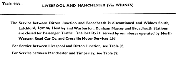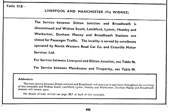Only a few months after renaming the station as Widnes South on 5 January 1959 British Railways was considered withdrawing the passenger service. Widnes South was being used by only half a dozen passengers per day. In the summer 1961 timetable the passenger service was wrongly shown as withdrawn with a note underneath stating that it was still operating. A timetable was added in the back of the timetable for the service.