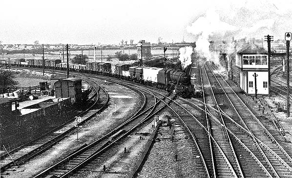 [Source: John Stevenson] ![]() British Railways former London Midland and Scottish Railway Stanier 8F 2-8-0 locomotive number 48363 of Toton MPD passes by Wigston South Junction signal box running off the up line from Glen Parva Junction onto the Up Passenger line. The photographer is standing on Station Road bridge opposite the entrance to Wigston Magna station.