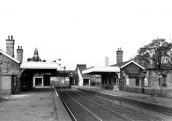 Wigston Magna station looking north from the down platform in November 1965. Wigston South Junction signal box is seen beyond the bridge.