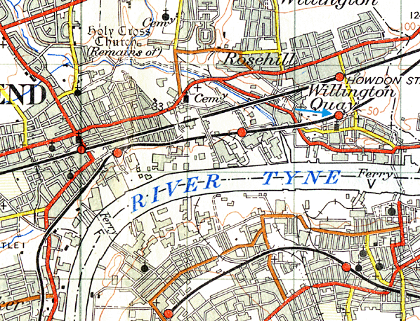 From St Peters to St Anthony's (1m 65c) there was a superb view of the River Tyne, immediately to the right. The Tyne's change of direction was followed by the railway from St Anthony's, where a sharp left curve began. Travelling north-eastwards the 182 yd Walker Tunnel was followed by Walker station (2m 78¾ c). Until Carville there was an uninterrupted view of shipyards and factories to the right, with glimpses of the river and Hebburn beyond. After a series of sidings, a tight curve to the right and a level crossing came Carville (4m 33c) situated close to Wallsend Shipyard’s entrance. Passing more industries and sidings on the right, Point Pleasant (5m 9c) was entered, overshadowed by the massive walls of Wallsend Slipway. The highlight of the journey to Willington Quay was a substantial bridge over the Wallsend Burn with a fine view of the viaduct on the Wallsend route to the north. Soon, Howdon gasworks dominated the view to the left, towering above Willington Quay station (5m 54½ c). The Wallsend line came into view, and the routes converged at Percy Main West Junction.