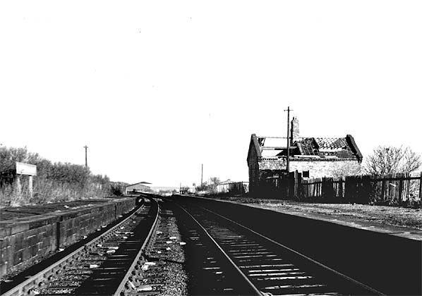 west end of the down platform was a brick built NER signal box, with a hipped-roof. The only building surviving at closure was the western cross-wing of the main building, with a large hole in the roof; a small section of the body of the building and a fragment of the awning and the columns that formerly supported the awning of the main building. The footbridge was still in place.