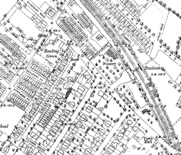 Work began on the line in 1878. Withington was the second intermediate station on the line from Manchester Central. It was located about a mile away from Withington itself, on the western edge of Didsbury. The station was located in a shallow cutting on the northeast side of Lapwing Lane and was provided with two platforms. The main station building |