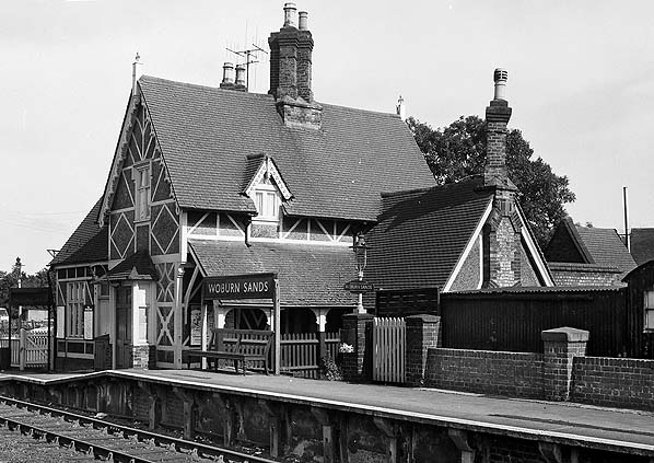 Woburn Sands station building on the up platform c late 1960s. By this date the station was unstaffed. The way out sign directing passengers out through the building has gone and the exit and entrance is now through the gate at the end of the platform.