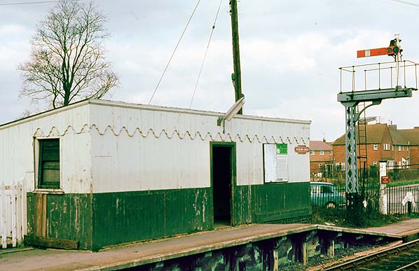 Woburn Sands down platform building in February 1977. When the platforms were rebuilt to the standard height in 1959 the original down platform building was retained in its original position and raised. It is looking rather shabby now and within two years it will be demolished. BR London Midland Region signage is also still in place in 1977 but this too would soon be gone.