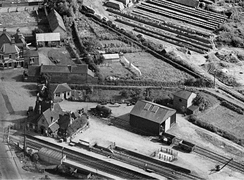 Aerial view of Woburn Sands station and goods yard in 1931. The two platforms are seen at the bottom. Behind the up platform two sidings serve the large cattle dock, one ending end on to the dock. Cattle pens are seen on the dock. Behind the pens there are two further sidings one of which passes through the large goods shed. The building behind it is a stable. The 5-ton capacity yard crane is seen bottom right. The goods office is seen at the entrance to the goods yard with the weigh office next to it. The weighbridge is in shadow alongside. The end of the coal depot can just be made out behind the down platform. Woburn Sands brick works is seen to the north of the station. The Station Hotel is seen top left and between the hotel and the weigh office there is a stable block.