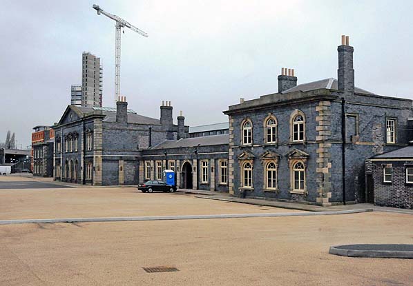 Wolverhampton GWR station was given an imposing frontage block designed by Sir John Fowler, Engineer to the OWWR, whilst Brunel, on behalf of the GWR, designed the layout. This was the last of Brunel’s one-sided single-platform stations with a central crossover and a 115ft span iron-trussed and pitched roof, 575ft long. Blue engineering brick screen walls supported the roof, with blind arcading which originally contained lunettes. The two-storey Italianate station building was also in blue engineering brick – not a material commonly associated with classical buildings, but it was a specialty of south Staffordshire. The centrepiece had a large pediment, and its round-headed windows were crowned with small pediments on scrolled brackets to match the rusticated quoins and ground-floor openings. On either side stretch plainer wings, one of two storeys and the other single, terminating in hipped-roof pavilions with ‘reversed fenestration’ – plain above and pedimented below. The lofty booking hall had heavy, squre pilasters, mid- and full-height cornices, and a coved ceiling up in the roof. The station is a Grade II listed structure. This description is drawn from G Biddle’s Britain’s historic railway buildings (2003).