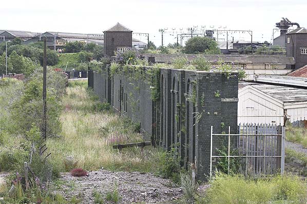 Wolverhampton Low Level Station in 2004. The wall to the rear of No. 2 platform which once supported the overall roof. Photo by Steven Jukes