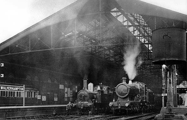 The south-eastern end of Wolverhampton Low Level station looking north-west in the first decade of the Twentieth Century. A mixed goods train can be seen standing on the up through line whilst a tank engine waits on the down through line.