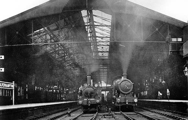 Copyright photo from the John Alsop collection ![]() A view looking north-west at Wolverhampton Low Level station in the first decade of the Twentieth Century. The size and scale of the trainshed roof is clearly demonstrated in this view.